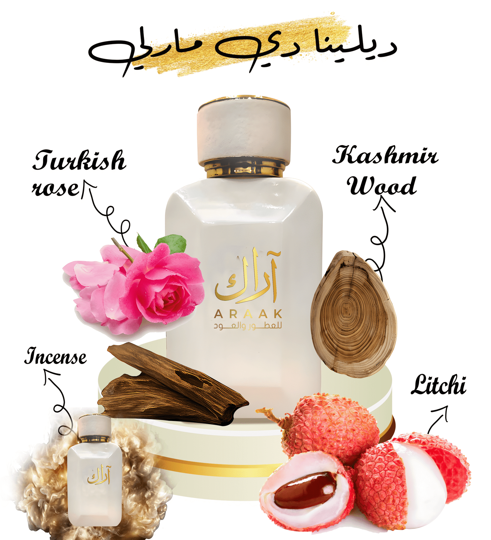 عطر أنثوي راقٍ ممزوج برائحة الورد والفاوانيا ولمسات من المسك الأبيض.
